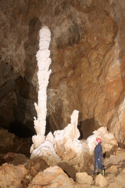 The best route is on the left hand side. However soon after rejoining the main passage a large 30m x 60m sump pool is reached. A route behind is a dry oxbow leading back, past some fine formations including the “Pagoda”, to the main passage.
